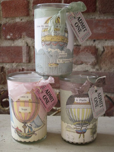 ![]() 4" unscented candle jar wrapped with assorted french hot air balloons embellished with ribbon and a touch of glitter wholesale $7 each (min. 6 per style) |