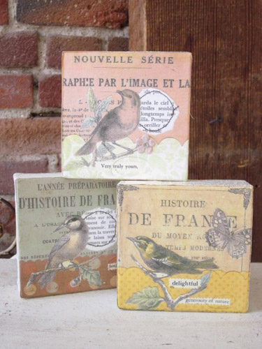 ![]() assorted bird and butterfly collages on petites 4 x 4" stretcher bar canvases sides are wrapped with vintage book pages wholesale $12 each (min. 3 assorted) |