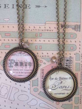 ![]() Vintage style necklace; assorted French script captured under glass. Hangs from lovely 24" chain; medallion is 1 1/2" wholesale $7 each (min. 6 per style) |