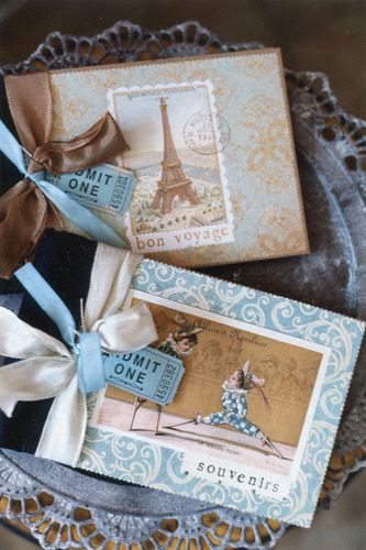 ![]() 4" x 7 1/2" photo book with assorted vintage french collages embellished with wired silk ribbon and a touch of glitter wholesale $12 each (min. 3 assorted) |