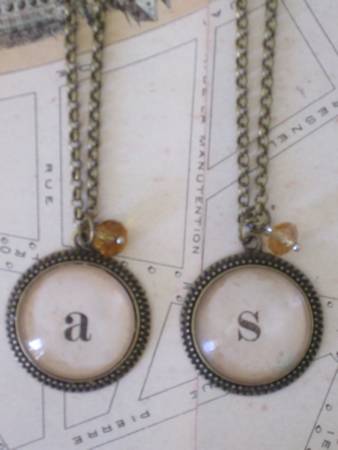 ![]() Vintage style necklace; specified initials captured under glass. Hangs from lovely 24" chain; medallion is 1" wholesale $7 each (min. 6 per style) |
