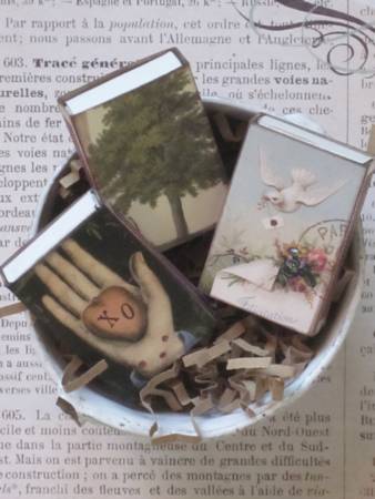 Vintage ![]() 2 x 1 1/2" match box collaged with assorted vintage images; touched with glitter wholesale $2 each (min. 12 assorted) |