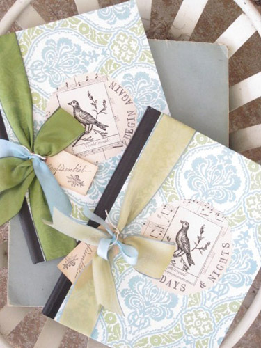 ![]() 8 "x 10" composition book wrapped in assorted bright colors bird imagery and tied with silk ribbon wholesale $12 each (min. 3 assorted) |