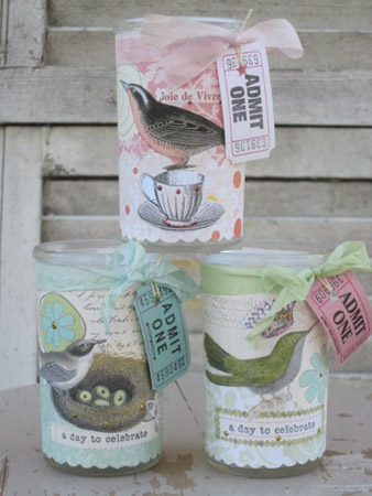 ![]() 4" unscented candle jar wrapped with assorted bird and nest collages garnished with ribbon wholesale $7 each (min. 6 per style) |